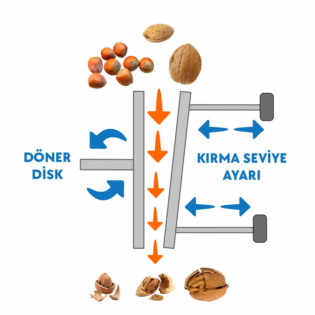 "V" biçiminde olan diskler arası kırım işlemi sayesinde ceviz, badem, fındık gibi tüm kabuklu yemişlerde boylarına göre ayırmaya gerek kalmadan başarılı kırım sağlar. Ancak bütün iç oranı yüksek isteniyosa boylama yapmak başarı oranını arttırır. Aşağıdaki şemada çalışma prensibi gösterilmektedir.