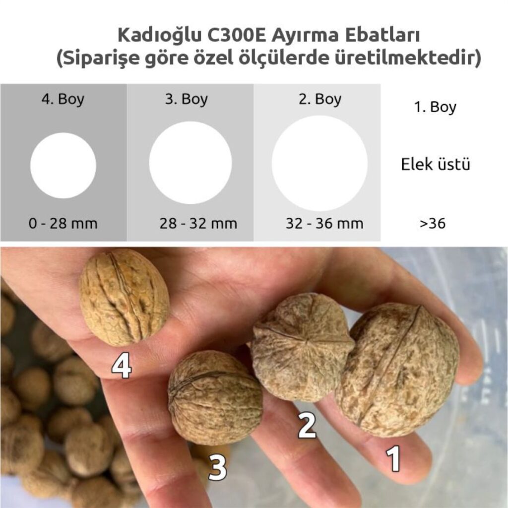 Kadıoğlu C300E Ceviz Boylama Makinesi kabuklu cevizi 4 farklı ebata ayırmaktadır. Ceviz için saatlik ortalama 750 kg - 1000 kg ayırma kapasitesine sahiptir.