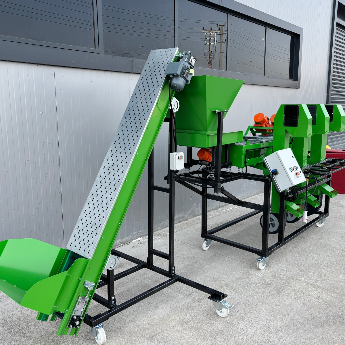 Makine, besleme konveyörü makine ile birlikte çalışır ve kırma makinesinden çıkan ürünün düzenli şekilde sisteme aktarılmasını sağlar.