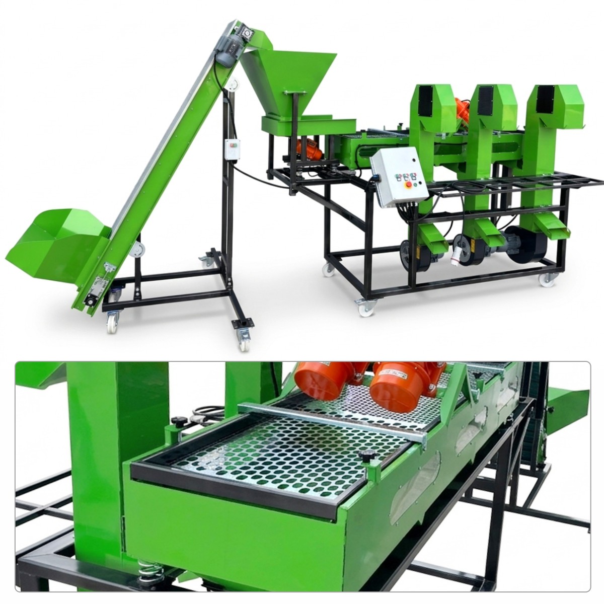 Makine, kırılmış ceviz karışımını titreşimli elek sistemi sayesinde 3 farklı boyuta ayırır. İç cevizler 1/8, 1/4 ve 1/2 olacak şekilde sınıflandırılır. Boyutlarına göre ayrılan ürünler daha sonra her boyut için ayrı üfleme sistemlerine yönlendirilir.
