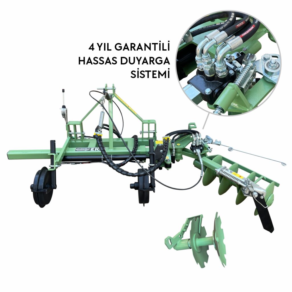 Klasik ya da bodur meyve bahçeleri, fidanlıklar, bağlar vb. yerlerde bitki diplerinde kalan çapalanması zor alanların çapalanması için tasarlanmış Kadıoğlu EKO Duyargalı Çapa Makinesi uzun yıllar hizmet edecek şekilde özel malzemelerle üretilmiştir. İncelediğiniz model duyargalı çalışan 4'lü diskaro ve ağaç, fidan diplerinde set oluşturmaya yarayan kapama ataşmanı ile birlikte set modeldir. Duyarga sistemi 4 yıl garantilidir.