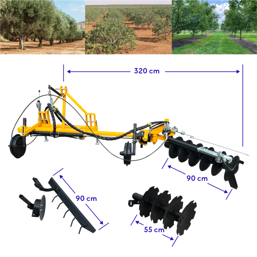 Kadıoğlu EXTRA Duyargalı Çapa Makinesinin klasik dikim zeytinlikler, geniş taşlı fıstık ağaçları, klasik dikim meyve bahçeleri için ekstra uzun şasi ve geniş alan işleyen ataşmanlarla tasarlanmış versiyonudur.