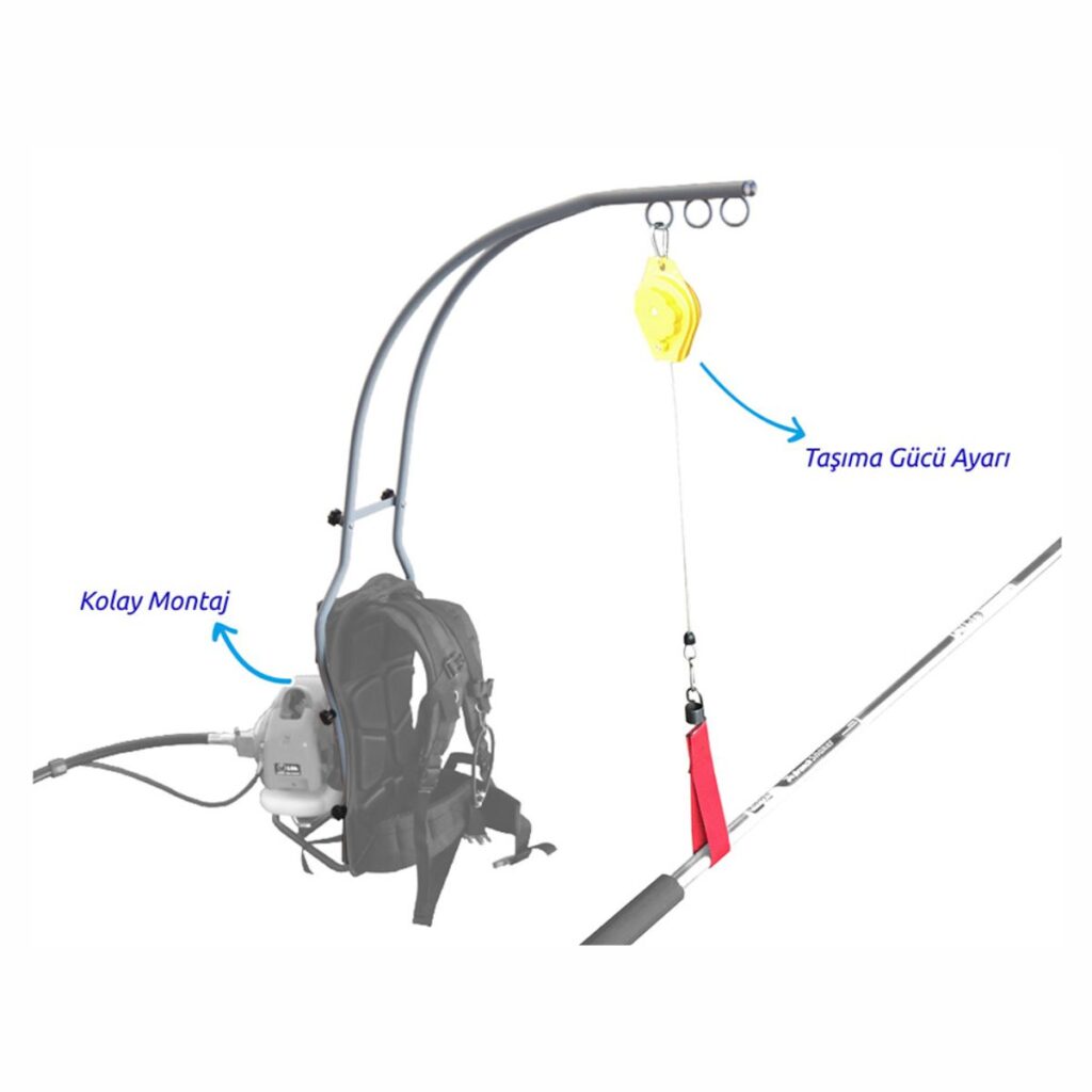 Kadıoğlu HMX Zeytin Hasat Makinesi kullanırken kollara binen yükün azaltılmasını sağlayan taşıma gücü ayarlı taşıma askısı. Kola binen yükün ne kadarını hafifleteceği ayar kısmından kolayca yapılır. Metal çerçeveli motor taşıma sırtlığı olan tüm hasat makinelerine montajı yapılabilmektedir.