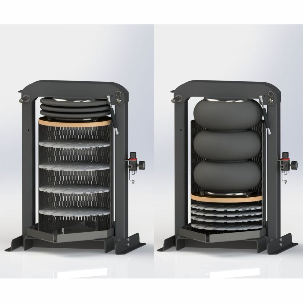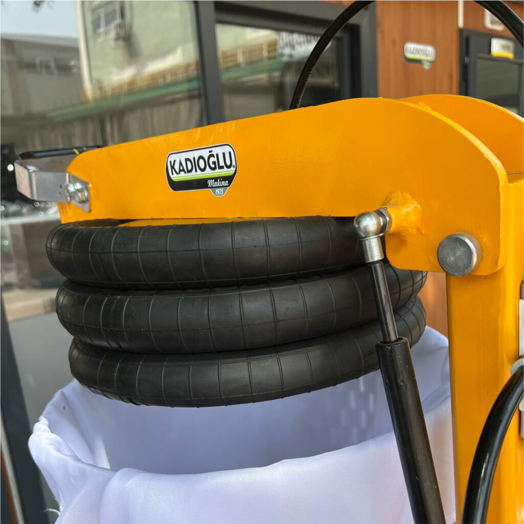 Kadıoğlu Dikey Körüklü Pnömatik Meyve Üzüm Presi kamyon körüğü ile sıkım yapar. Bu yöntem zahmetsizce 3 tonluk bir basınç ile sıkım yapmayı sağlamaktadır. (Daha yüksek basınçlara çıkmak mümkündür ancak ihtiyaç yoktur.)