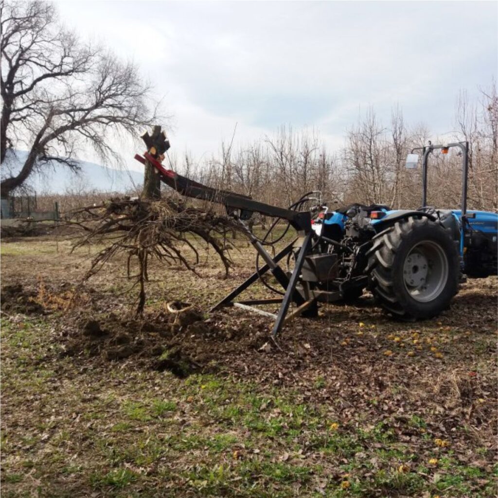 Meyve ağaçlarının sökülmesi işlemi için genellikle ağır iş makineleri çalıştırılmaktadır. Yeni ağaç kökü sökme ekipmanımız bu ihtiyacı ortadan kaldırarak sökme işlemini traktörle yapmayı sağlamaktadır.