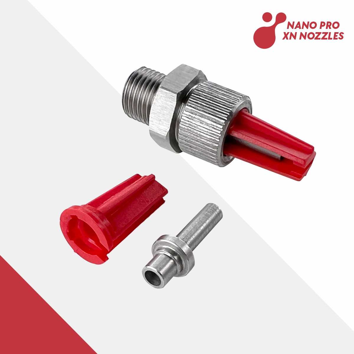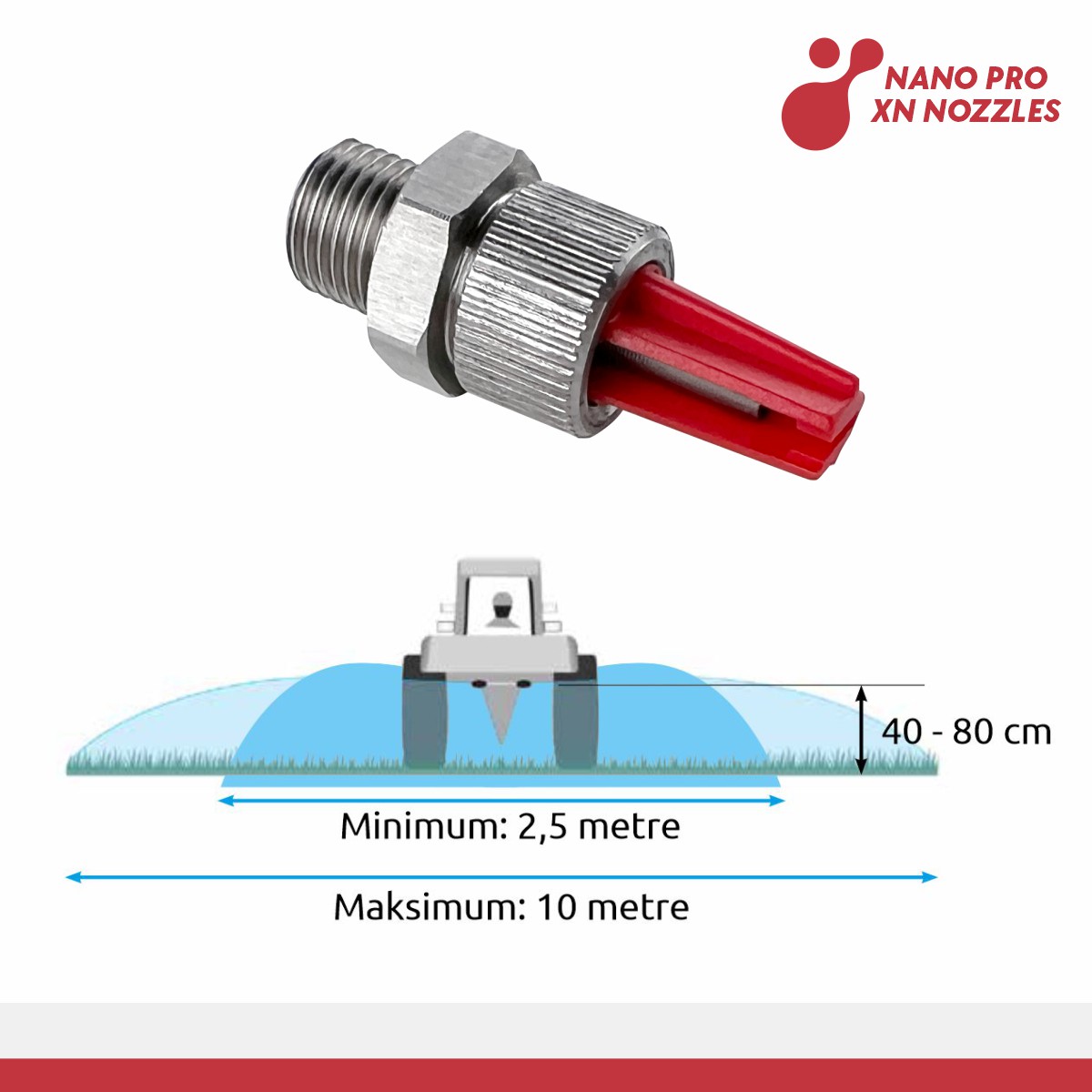 Nano İlaçlama Aparatı nozullarını, kendi ilaçlama makinesi ve aparatlarınızda kullanmak üzere ayrı olarak temin edebilirsiniz. Nano XN serisi özel üretim nozullar, uçuşmaya yol açan mikro damlacıklar oluşturmaz. Püskürtülen su, ince yağan bir yağmur gibi yere düşer. Bu nozullar, maksimum 16 km/saat hızla kullanılmak üzere uygundur; daha yüksek hızlarda püskürtme deseninde kaymalar olabilir.