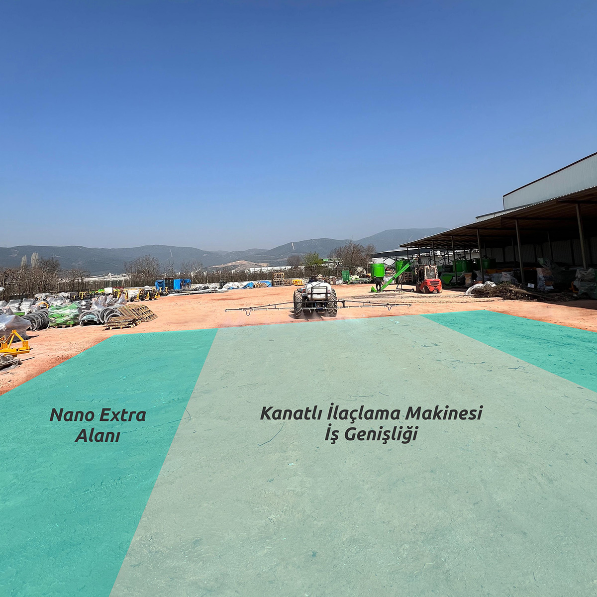 (12 metre kanatlı ilaçlama makinesi kolu ile toplamda 20-22 metre arası alan ilaçlanabilmektedir.)