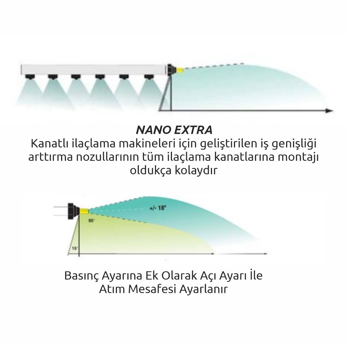 Kadıoğlu NANO XN1 EXTRA Bom Uzatma Nozulları (Yeni nesil çatal meme) halihazırdaki kanatlı ilaçlama makinelerinin ilaçlama genişliğini arttırmaya yarar. Yakıt tasarrufu sağlayan ve tekerlek izi azaltmaya yarayan özel üretim nozullar kendini çok kısa sürede amorti etmektedir. Tüm parçaları ayrı ayrı değiştirilebilir nitelikte olan NANO XN1 Nozullar uçuşmaya sebep olacak mikro damlacıklar üretmez. Püskürtülen su tıpkı ince yağan bir yağmur gibi düşer. Maksimum 16 km/saat hızla kullanıma uygundur. Daha yüksek hızlarda desen kaymaları olabilir.