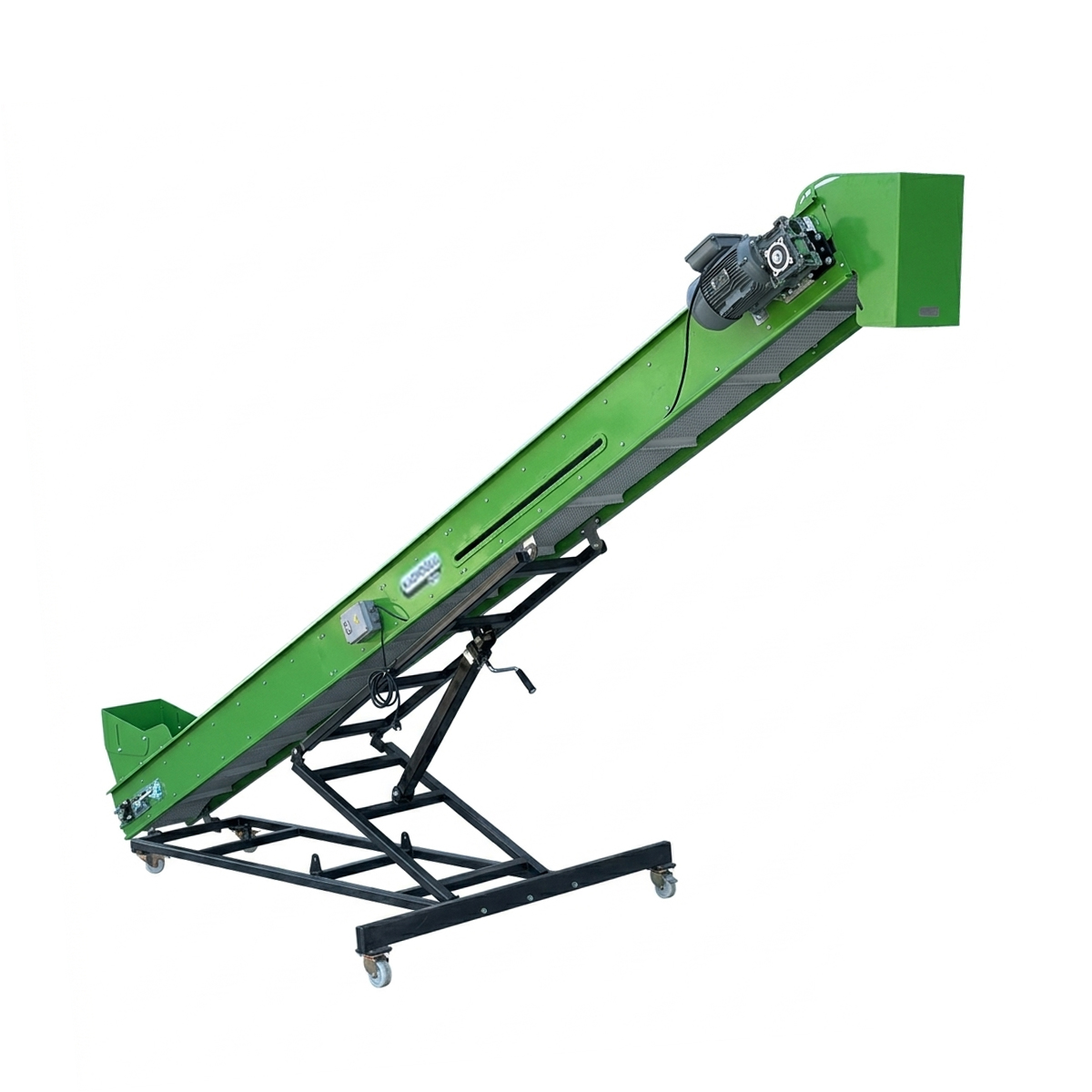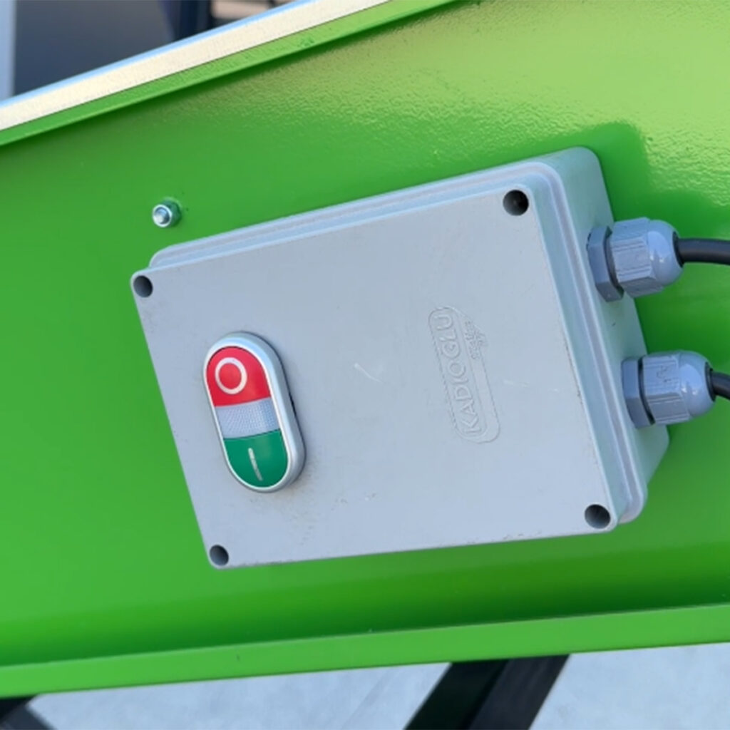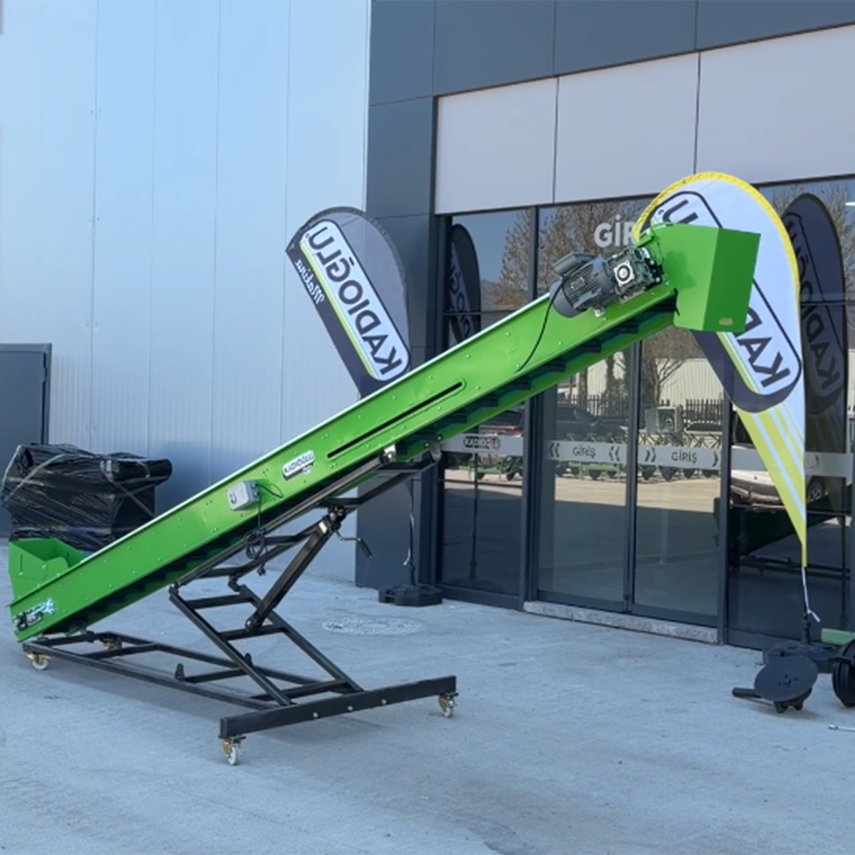 Kadıoğlu NUTMEC7K yükseklik ayarlı açılı konveyör bant ceviz, badem, fındık gibi kabuklu yemişlerin Kadıoğlu 5200, 5500 ve 6500 serisi kurutma makinelerine doldurulması ve tahliyesi için tasarlarlanmış ve uzun yıllar kullanılacak şekilde yüksek kaliteli endüstriyel malzemelerle üretilmiştir.