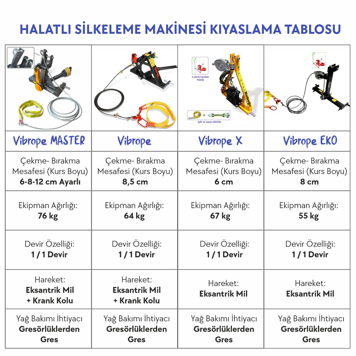 Çelik halat ne kadar kısa ve hafif tercih edilirse silkeleme başarısı artar. Halat boyu uzadıkça halat bel vermeye başlayacağı için silkeleme performansını olumsuz yönde etkileyebilir. Makinenin halat boyunu dilediğiniz ölçüye kısaltabilirsiniz. Traktörün hasat edilen mahsülü ezmeyeceği halat boyu yeterlidir. Bu boy, genç ağaçlarda 4-6 metre yaşlı ağaçlarda ise 8-10 metrelere çıkabilmektedir.