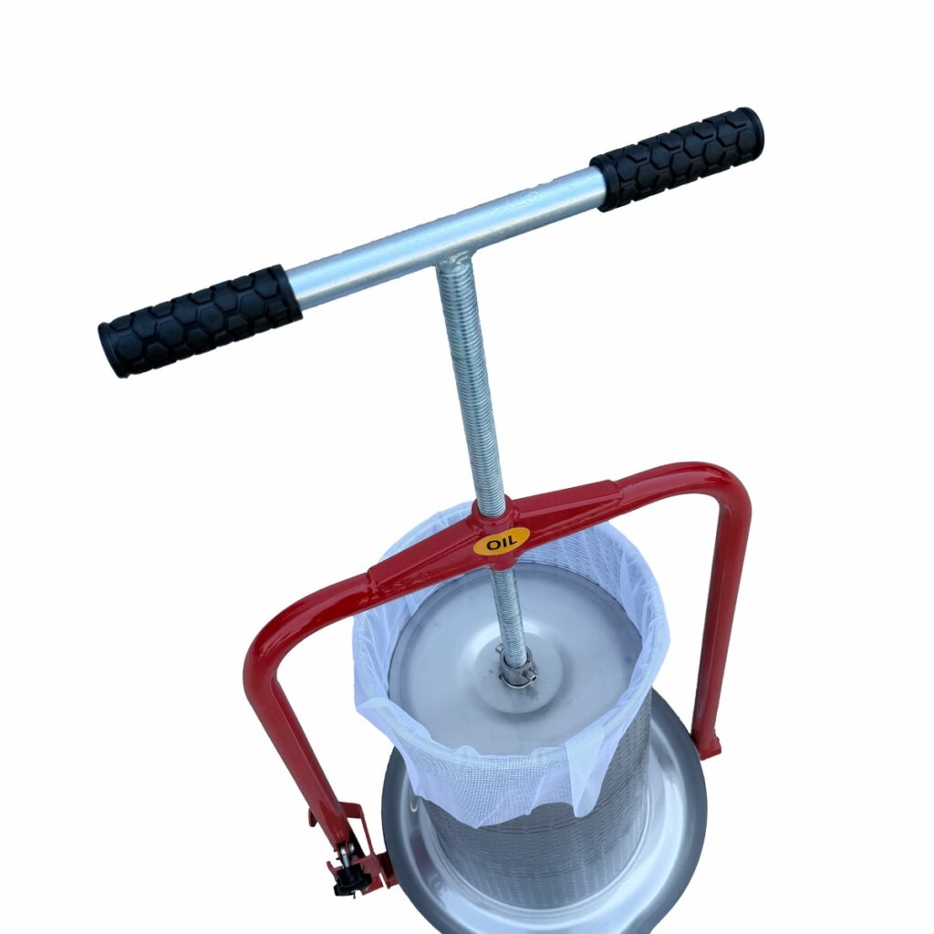 2: Pres kolu saat yönünde çevrildikçe pres tablası ürünün üzerine baskı uygular ve çıkan sıvı ön kısımdaki tahliye bölümünden akmaya başlar.